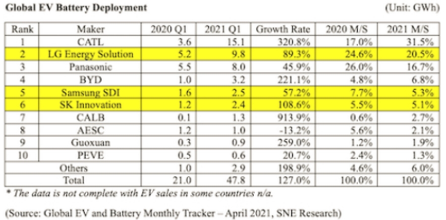 據(jù)韓國行業(yè)調(diào)研機構(gòu)SNE Research最新發(fā)布的數(shù)據(jù),2021年第一季度全球電動車電池能耗為47.8 GWh,同比增長127%,其中寧德時代的一季度大幅增長為主要推動力。