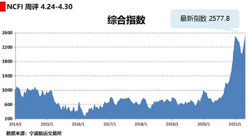 寧波航運(yùn)交易所發(fā)布的海上絲綢之路指數(shù)之寧波出口集裝箱運(yùn)價(jià)指數(shù)(NCFI)顯示:4月24日至30日,該指數(shù)報(bào)收于2577.8點(diǎn),較上周上漲7.0%,綜合指數(shù)突破年前高位(2021年1月8日?qǐng)?bào)收于2498.5點(diǎn)),刷新歷史新高。