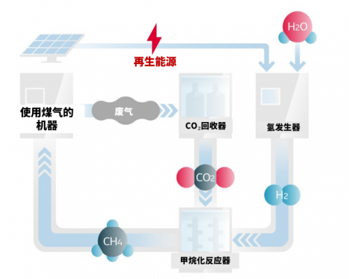 驗(yàn)證測(cè)試CO?循環(huán)設(shè)施的設(shè)想為:首先回收在工廠產(chǎn)生的CO?,然后循環(huán)再利用到能量源及其它材料中。在這里,會(huì)先驗(yàn)證通過回收從使用煤氣的機(jī)器里所排放出的CO?,和從利用電力再生能源所生成的氫氣合成甲烷并作為能量源進(jìn)行再利用的過程。