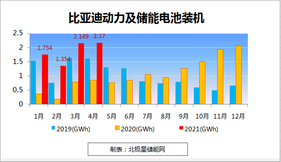 近日,比亞迪官方公布了2021年4月產(chǎn)銷情況。2021年4月新能源汽車動(dòng)力電池及儲(chǔ)能電池裝機(jī)總量約為 2.170GWh,本年累計(jì)裝機(jī)總量約為 7.428GWh。