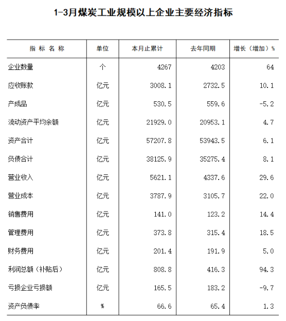 指標顯示,一季度,4267家規(guī)模以上煤炭企業(yè)營業(yè)收入5621.1億元,同比增長29.6%,增幅比規(guī)模以上工業(yè)行業(yè)平均低9.1個百分點;營業(yè)成本3787.9億元,同比增長22.0%;應(yīng)收賬款3008.1億元,同比增長10.1%;利潤總額(補貼后)808.8億元,同比增長94.3%,增幅比規(guī)模以上工業(yè)行業(yè)平均低42個百分點。