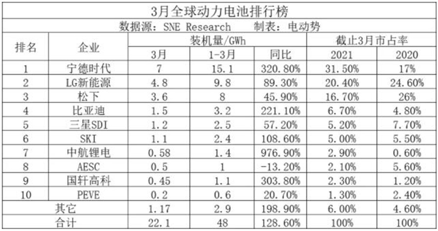根據(jù)SNE統(tǒng)計的數(shù)據(jù),3月全球動力電池一共裝機量22.1GWh,1-3月累計裝機量48GWh,同比增長128.6%。這表明,盡管動力電池市場已經(jīng)過了一輪洗牌期,但仍處于高速增長期,新一輪增長凸顯出成熟市場才具備的馬太效應(yīng)——強者恒強。