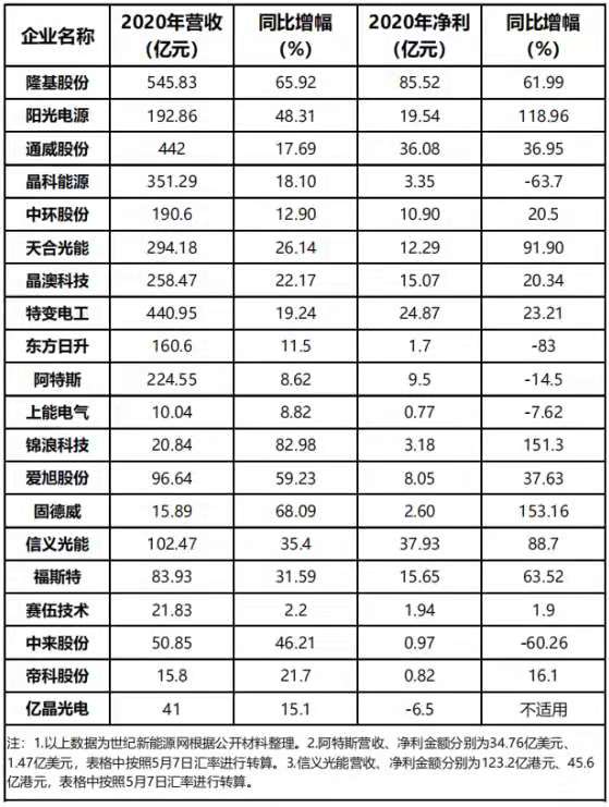 2020年,中國(guó)光伏行業(yè)依舊發(fā)展快速。根據(jù)中國(guó)光伏行業(yè)協(xié)會(huì)統(tǒng)計(jì),2020 年國(guó)內(nèi)光伏新增裝機(jī)量為 48.2GW,同比增長(zhǎng) 59.50%,連續(xù) 8年位居全球首位。截至 2020 年底,國(guó)內(nèi)光伏累計(jì)并網(wǎng)裝機(jī)量達(dá) 253GW,同比增長(zhǎng)23.5%。世紀(jì)新能源網(wǎng)選取20家上市光伏企業(yè)2020年業(yè)績(jī),以期大家更能了解在過(guò)去一年中中國(guó)光伏企業(yè)的發(fā)展概況。此20家上市企業(yè)在2020年總營(yíng)收額在3561億元左右。