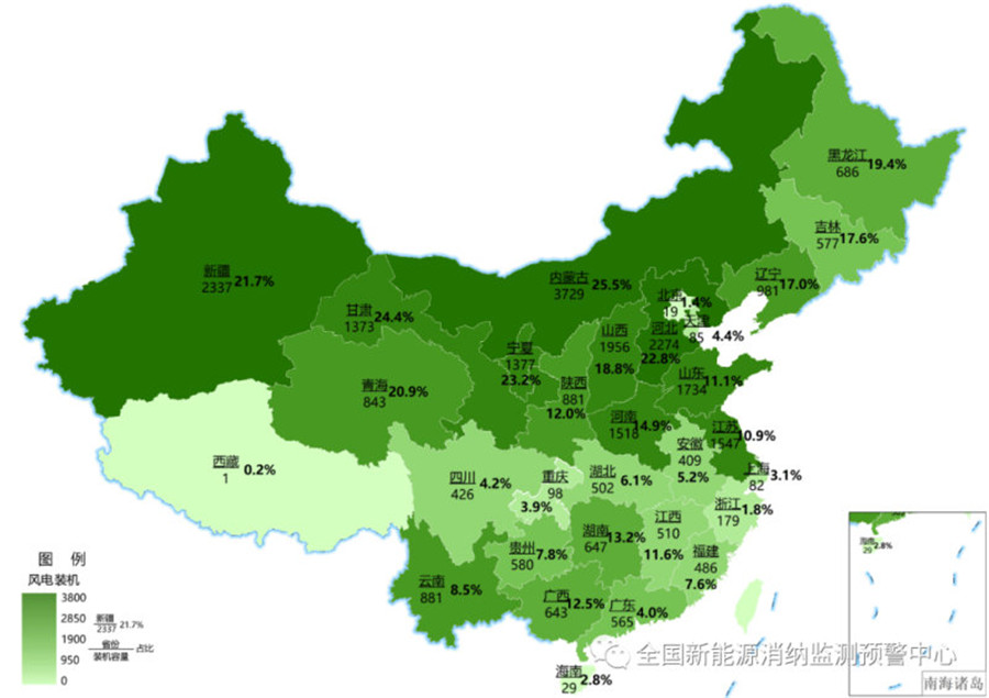 圖一、截至2020年底各地區(qū)累計風(fēng)電裝機(jī)(萬千瓦)及占本地區(qū)總裝機(jī)比重