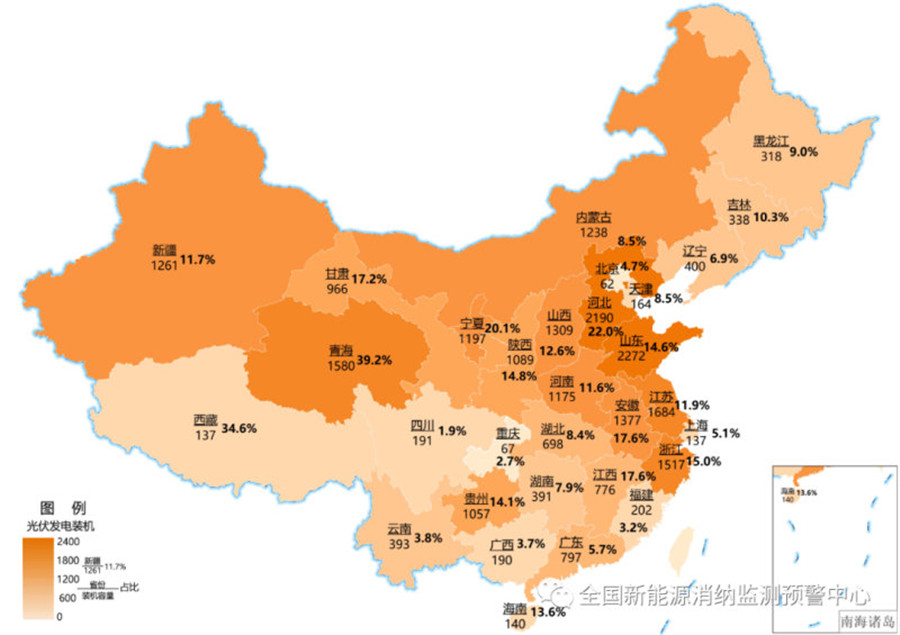 圖二、截至2020年底各地區(qū)累計光伏發(fā)電裝機(jī)(萬千瓦)及占本地區(qū)總裝機(jī)比重