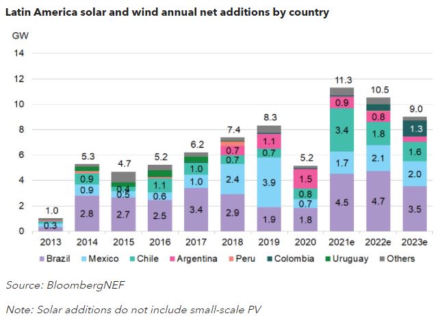 在經(jīng)歷艱難的2020年之后,今年風(fēng)能和太陽能將在拉丁美洲得到快速發(fā)展,根據(jù)彭博社新能源財經(jīng)預(yù)計,新的裝機容量將首次超過10吉瓦(GW)。