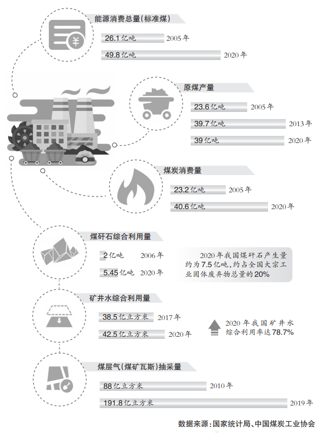國(guó)家統(tǒng)計(jì)局?jǐn)?shù)據(jù)顯示,近年來(lái),我國(guó)煤炭生產(chǎn)和消費(fèi)量隨經(jīng)濟(jì)社會(huì)快速發(fā)展而大幅增長(zhǎng),能源消費(fèi)總量由2005年的26.1億噸標(biāo)準(zhǔn)煤增至2020年的49.8億噸標(biāo)準(zhǔn)煤。全國(guó)原煤產(chǎn)量2005年為23.6億噸,2013年達(dá)到階段峰值39.7億噸。此后煤炭產(chǎn)量雖有回落,但2020年仍達(dá)到39億噸。據(jù)國(guó)家統(tǒng)計(jì)局相關(guān)數(shù)據(jù)測(cè)算,煤炭消費(fèi)量由2005年的23.2億噸增至2020年的40.6億噸。