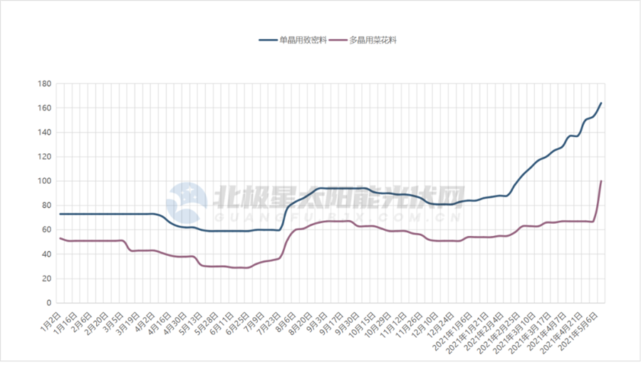 根據(jù)最新價(jià)格公示,本周單晶用致密料價(jià)格漲至164元/kg,較年初上漲98%,市場最高成交價(jià)甚至來到180元/kg,多晶用菜花料價(jià)格也達(dá)到100元/kg。