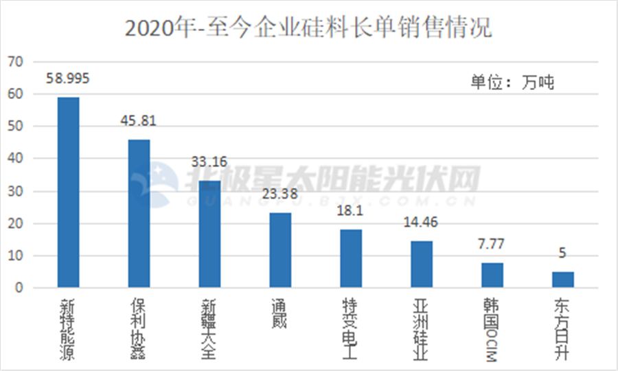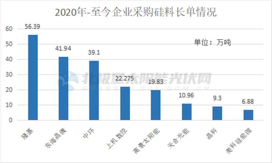 另一方面頭部企業(yè)的長單爆發(fā)加劇了市場的緊張情緒。據(jù)北極星太陽能光伏網(wǎng)統(tǒng)計(jì)信息,從2020年至今,未來3~5年的超200萬噸硅料已被長單鎖定。