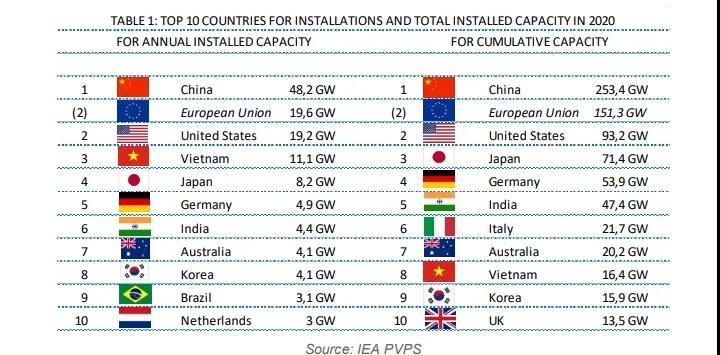 2020年新增光伏裝機(jī)的前十個(gè)國家分別為:中國、美國、越南、日本、德國、印度、澳大利亞、韓國、巴西和荷蘭。在過去幾年裝機(jī)容量很大的幾個(gè)國家,包括法國、墨西哥和土耳其等,發(fā)展勢(shì)頭明顯減弱,已經(jīng)退出了前十的位置。