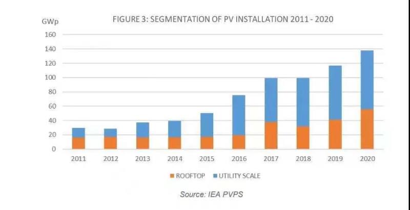 初步數(shù)據(jù)顯示,與2019年相比,2020年公用事業(yè)規(guī)模的光伏市場略有增長,但隨著屋頂市場的增加,其市場份額相對(duì)下降。得益于越南屋頂光伏的爆發(fā),以及澳大利亞、德國和美國的部分增長,屋頂光伏容量在2020年實(shí)現(xiàn)了明顯的提升。