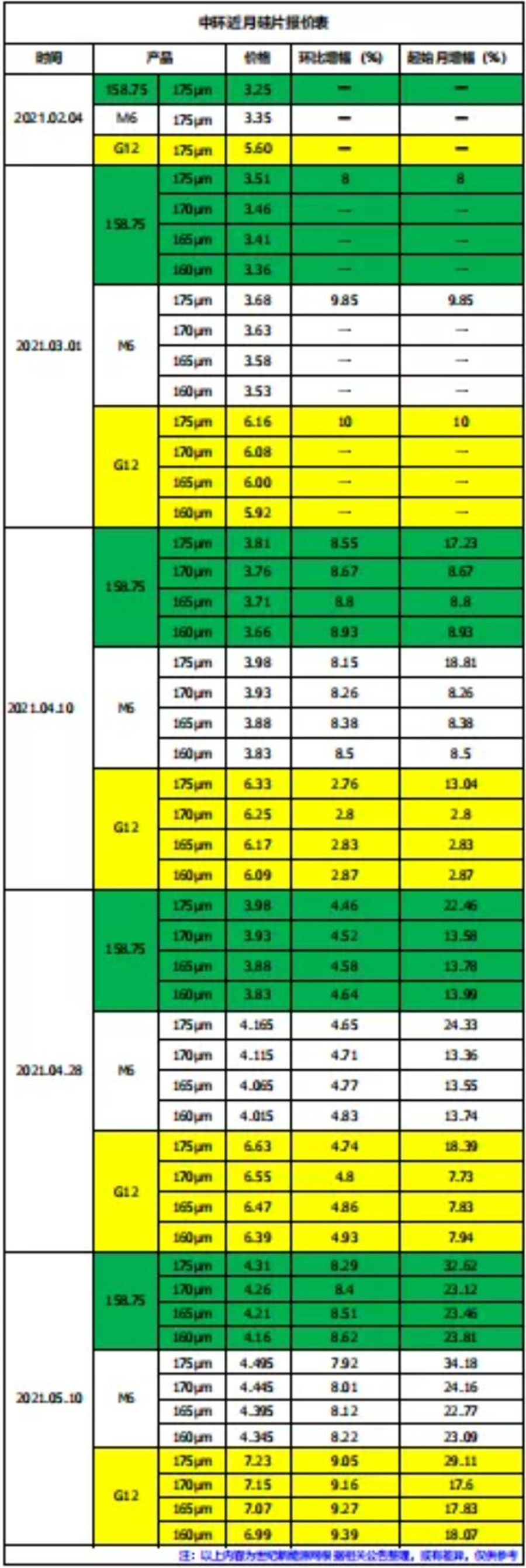 距4月28日報價之后的十余天,5月10日,媒體報道中環(huán)上調產品價格,價格區(qū)間在0.33-0.6元/片,相較而言,此次價格增長幅度較大,上漲幅度最大的產品為160μm的G12硅片,漲幅為9.39%;漲幅最小的為175μm的M6硅片,漲幅為7.92%。