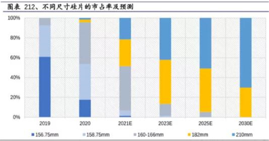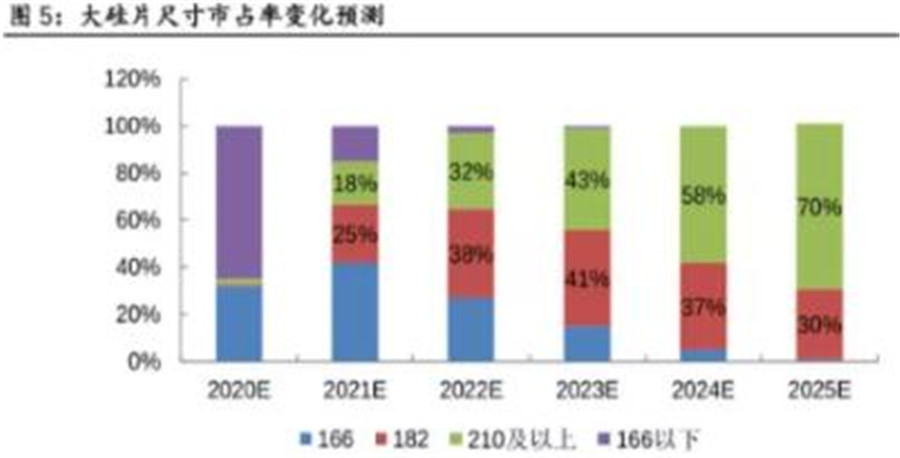 在PVInfoLink的相關預測中不難發(fā)現(xiàn),其同樣較為看好大尺寸硅片的發(fā)展,預計2021年182、210及以上的市占率將達43%,較2020年有著大幅度的提高。2022年,182、210及以上市占率將達70%。