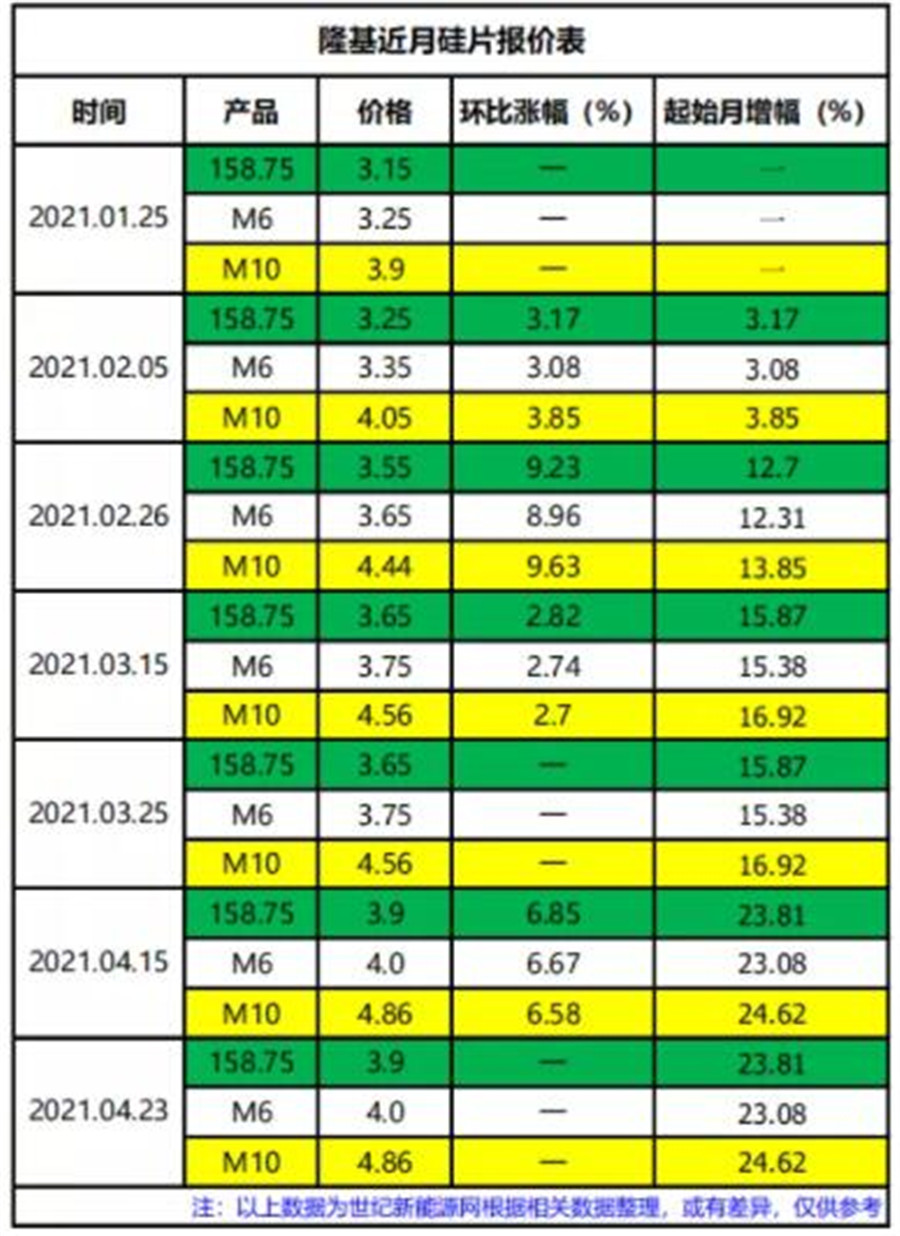 從2021年1月25日至2021年4月23日,隆基158.75、166、182產品的漲幅分別為23.81%、23.08%、24.62%。漲幅同樣明顯。