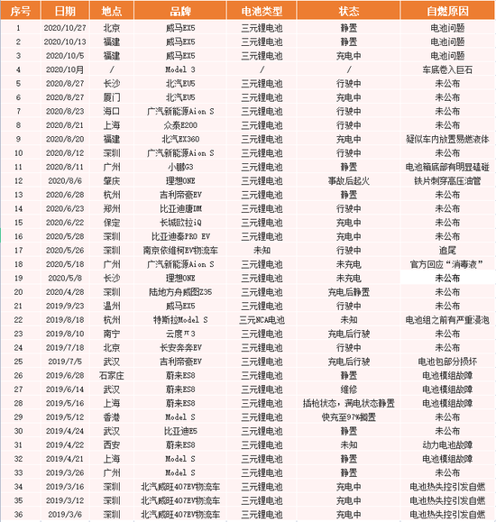 據(jù)盒飯財經(jīng)不完全統(tǒng)計,從2019年3月到去年12月,國內(nèi)電動車發(fā)生自燃事故共有36起,其中有33起事故車輛,搭載的電池類型均為三元鋰電池,而關(guān)于自燃原因,據(jù)已公布消息顯示,其中14起均與電池相關(guān)。