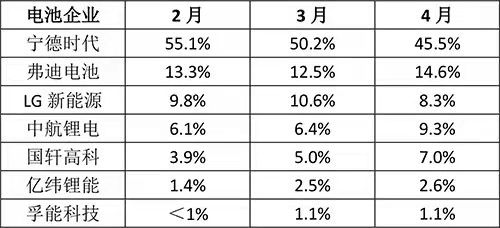 作為龍頭的寧德時代1-4月裝機(jī)量達(dá)到16.04GWh,前4個月總的市占率仍然超過中國市場裝機(jī)量的一半,達(dá)到50.7%,但如前所述,其自2月份以來,市占率在逐漸下降。