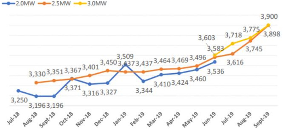 風(fēng)機(jī)價(jià)格同步上漲。政策出臺(tái)的2019年年底,風(fēng)電機(jī)組公開投標(biāo)均價(jià),已從年初的3000元/kw左右,飆升至超過4100元/kw。