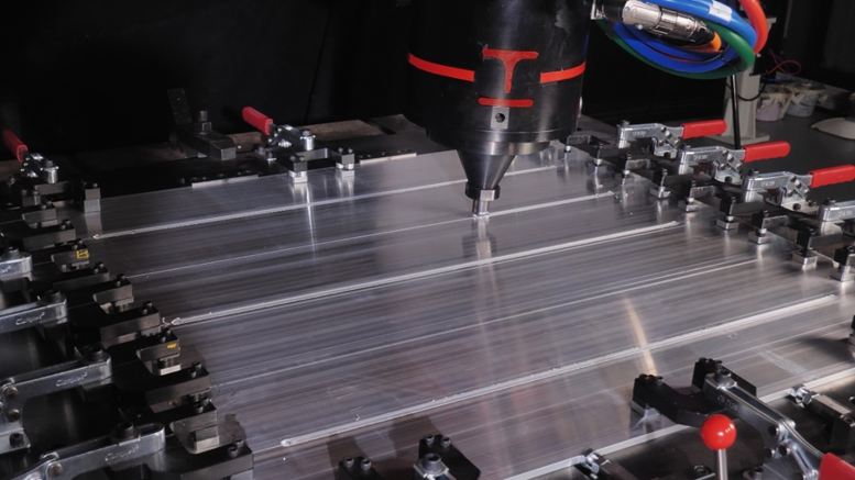 采用恒壓力靜止軸肩攪拌摩擦焊,實(shí)現(xiàn)低熱輸入,無飛邊高速焊接,總寬1.5m的底板,焊后平面度可控制1mm,有效改善焊接精度和質(zhì)量。焊接速度最高可達(dá)3000mm/min,焊接后也無需毛刺去除和打磨等工藝,可降低客戶的焊接時(shí)間和成本。