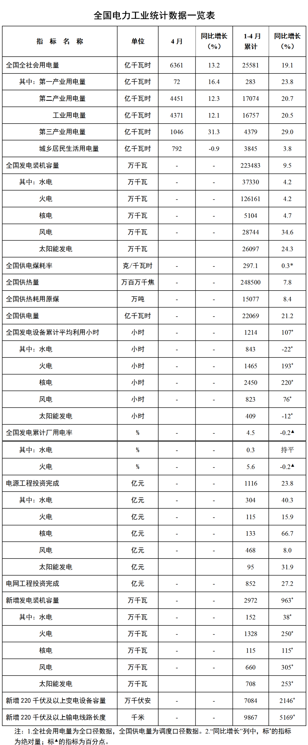 5月19日,國家能源局發(fā)布1-4月份全國電力工業(yè)統(tǒng)計數(shù)據(jù)。截至4月底,全國發(fā)電裝機容量22.3億千瓦,同比增長9.5%。其中,風(fēng)電裝機容量2.9億千瓦,同比增長34.6%;太陽能發(fā)電裝機容量2.6億千瓦,同比增長24.3%。