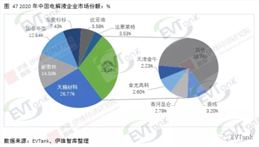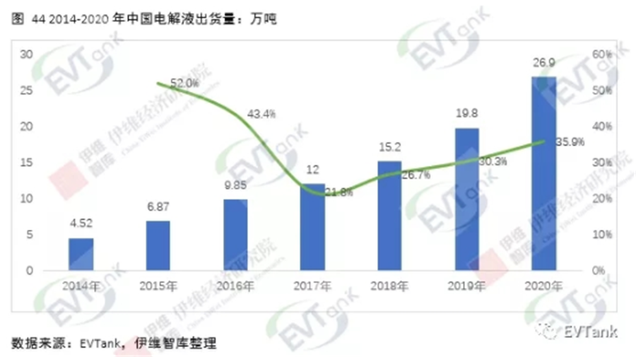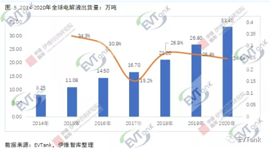 近日,研究機(jī)構(gòu)EVTank聯(lián)合伊維經(jīng)濟(jì)研究院共同發(fā)布了《中國(guó)鋰離子電池電解液行業(yè)發(fā)展白皮書(2021年)》,白皮書數(shù)據(jù)顯示,2020年全球鋰離子電池電解液出貨量達(dá)到33.4萬(wàn)噸,同比增長(zhǎng)24.6%,整體市場(chǎng)規(guī)模達(dá)到152.7億元。EVTank分析認(rèn)為,2020年全球鋰離子電池電解液出貨量的增長(zhǎng)主要來(lái)自于中國(guó)企業(yè)。