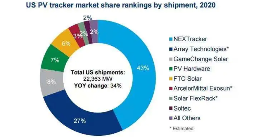 2020年,在美國市場22.36GW的出貨總量中,NEXTracker和Array Technologies以70%的絕對優(yōu)勢占據(jù)了大部分的市場份額。得益于ITC政策的延期,美國市場的供應商在鞏固原有份額的基礎上獲得了進一步的增長。