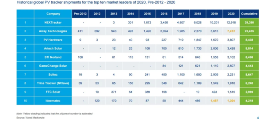 截止2020年十大跟蹤支架廠商出貨量數(shù)據(jù) 來源:伍德麥肯茲