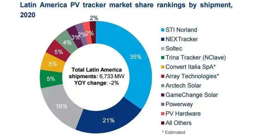 2020年,拉丁美洲市場跟蹤支架出貨6.73GW,雖然巴西和智利都有不同程度的增長,但是整個地區(qū)與上一年相比僅增長2%。STI Norland公司的出貨占比明顯增長。從上一年的17%提高到了35%,穩(wěn)居該市場第一位。NEXTracker 和Soltec則分別排在第二和第三。