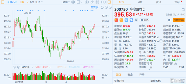 寧德時(shí)代董事長(zhǎng)曾毓群對(duì)外透露,寧德時(shí)代將于2021年7月前后發(fā)布鈉電池。5月24日,寧德時(shí)代股價(jià)上漲3.3%,今天繼續(xù)收漲2%。