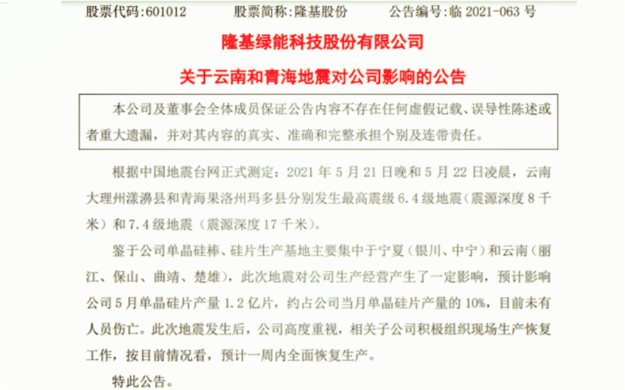 響5月24日晚間,隆基股份發(fā)布關(guān)于云南和青海地震對公司影響的公告。公告表示,根據(jù)中國地震臺網(wǎng)正式測定,2021年5月21日晚和5月22日凌晨,云南大理州漾濞縣和青海果洛州瑪多縣分別發(fā)生最高震級6.4級地震(震源深度8千米)和7.4級地震(震源深度17千米)。