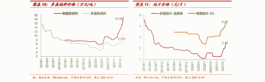 則表示,當前硅料價格持續(xù)上漲,單晶方面,五一后成交價在缺料的影響下進一步上揚,目前一線企業(yè)已經(jīng)有價無貨;多晶方面,價格跟隨單晶料漲價。同時,硅片價格上漲,單晶方面,硅料短缺影響開工率,電池廠反應(yīng)硅片長單交付量不足,價格堅挺;多晶方面,印度需求受疫情影響稍有放緩,但硅料上漲繼續(xù)推高價格。