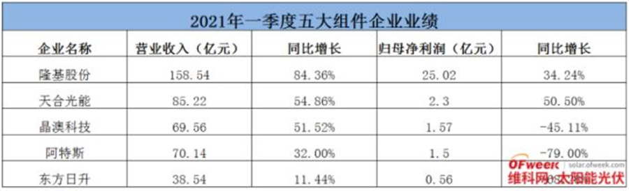 可以看到,在營(yíng)收方面,隆基股份、天合光能、晶澳科技、阿特斯及東方日升均同比上漲。其中隆基股份增幅最大,達(dá)到了84.36%,同時(shí)高達(dá)158.54億元的營(yíng)收也是傲視群雄。增幅最低企業(yè)為東方日升,同比漲幅為11.44%,營(yíng)收也是榜單中最低值。