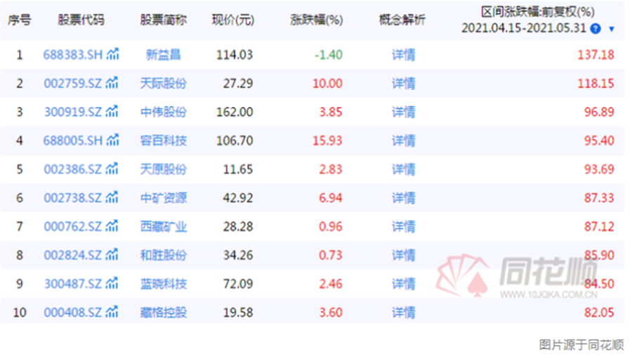 鋰電池板塊行情從4月中旬啟動(dòng),已累計(jì)上漲一個(gè)月有余。統(tǒng)計(jì)顯示,4月14日至今天30個(gè)交易日,共有11只鋰電池概念股累計(jì)上漲50%以上。