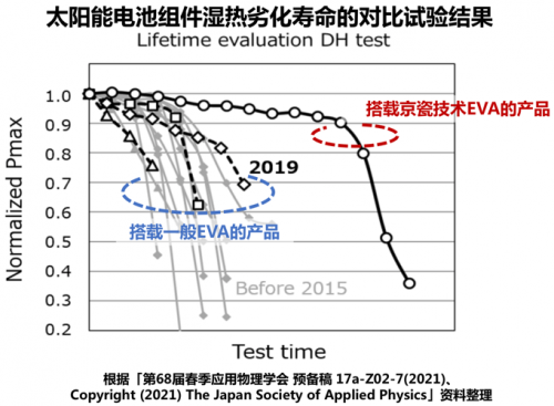 用于太陽能電池組件的封裝材料是一種保持太陽能電池片、并使表面的玻璃和背面的背板粘在一起、保護太陽能電池片不受水分滲入等外部環(huán)境影響的部件。通常,太陽能電池組件在紫外線、濕度和熱量等的作用下,會在由乙烯-乙酸乙烯酯共聚物(EVA)組成的封裝材料內部中產生酸,并且由于這種酸的產生會使太陽能電池片的電極劣化,從而導致太陽能電池組件出現(xiàn)發(fā)電效率降低的問題。針對這個問題,本專利技術通過抑制EVA中酸的產生從而使減少太陽能電池片的電極劣化成為可能,為此京瓷的太陽能電池組件實現(xiàn)了較高的長期可靠性。