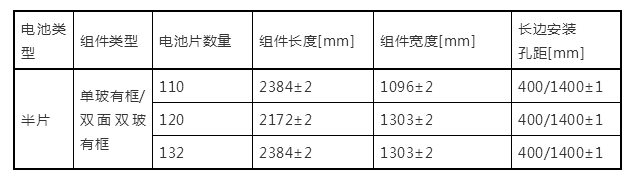 針對半片110片(整片55片)電池組件,長度確定為2384±2 mm,寬度為1096±2mm,長邊方向安裝孔位置為400/1400±1mm。三款210產(chǎn)品尺寸明細,具體參見下表: