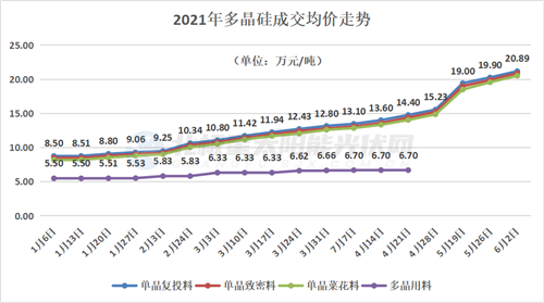 自2021年以來,多晶硅價價格便開啟了直線上漲模式。據(jù)統(tǒng)計,自年初以來單晶復投料漲幅達到了141.89%,單晶致密料漲幅達到了145.769%,單晶菜花料漲幅達到了150.24%。并且,硅料價格長單、散單價格還在延續(xù)上漲勢頭。據(jù)悉,6月份有三家萬噸級硅料企業(yè)被迫計劃檢修,預計6月份國內(nèi)多晶硅產(chǎn)量將進一步減少,降幅在3%左右。