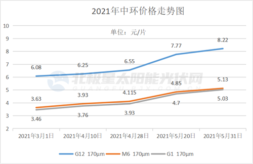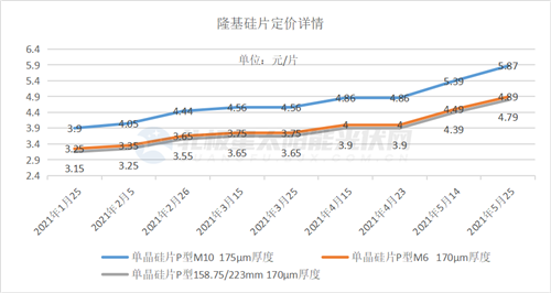 值得關(guān)注的是,硅料價格上漲壓力正在不斷向下傳導。5月,兩家硅片龍頭企業(yè)一個月內(nèi)相繼2次宣布上調(diào)了硅片價格。截止至5月末,隆基M10硅片最新報價達5.87元,M6硅片價為4.89元,G1硅片價為4.39元,較4月23日的報價漲幅分別為20.78%、22.25%、22.82%。中環(huán)G12( 170μm)硅片最新價格為8.22元、M6( 170μm)硅片價為5.13元,G1( 170μm)硅片價為5.03元,分別較4月28日報價上漲25.5%、24.6%、27.99%。