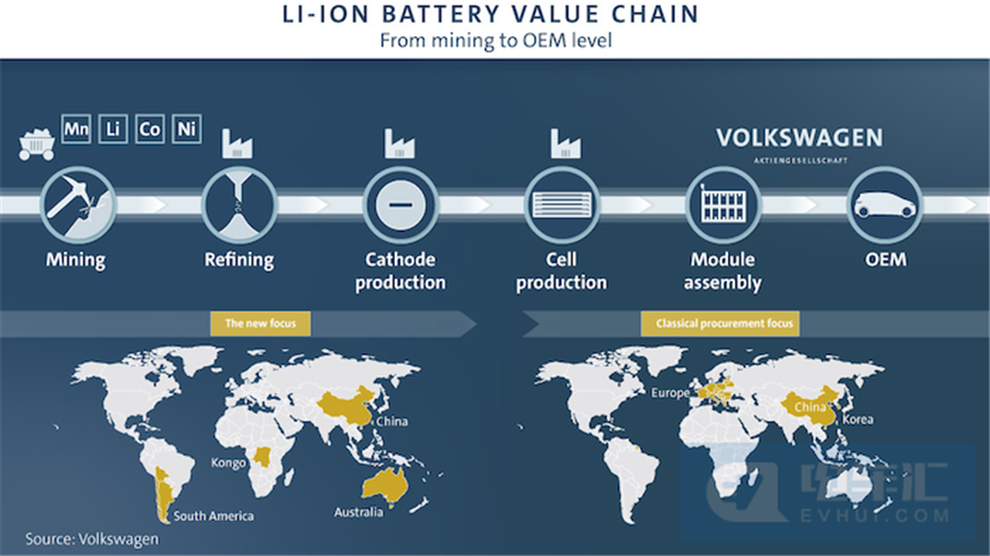 除了直接布局動力電池生產(chǎn),大眾為了減少電池供應(yīng)商的依賴,還計劃從電池研發(fā)到回收利用全面布局,形成一個完整的價值鏈,特別是原材料方面。據(jù)Thomas Schmall介紹,原材料在電池生產(chǎn)成本的比例高達80%,因此在電池領(lǐng)域必須深入供應(yīng)鏈,積極參與原材料業(yè)務(wù)。