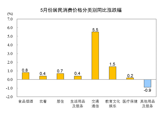 5月份,食品煙酒類(lèi)價(jià)格同比上漲0.8%,影響CPI(居民消費(fèi)價(jià)格指數(shù))上漲約0.24個(gè)百分點(diǎn)。食品中,蛋類(lèi)價(jià)格上漲14.3%,影響CPI上漲約0.08個(gè)百分點(diǎn);水產(chǎn)品價(jià)格上漲13.8%,影響CPI上漲約0.25個(gè)百分點(diǎn);鮮菜價(jià)格上漲5.4%,影響CPI上漲約0.10個(gè)百分點(diǎn);鮮果價(jià)格上漲1.4%,影響CPI上漲約0.03個(gè)百分點(diǎn);糧食價(jià)格上漲0.8%,影響CPI上漲約0.01個(gè)百分點(diǎn);畜肉類(lèi)價(jià)格下降11.3%,影響CPI下降約0.46個(gè)百分點(diǎn),其中豬肉價(jià)格下降23.8%,影響CPI下降約0.50個(gè)百分點(diǎn)。