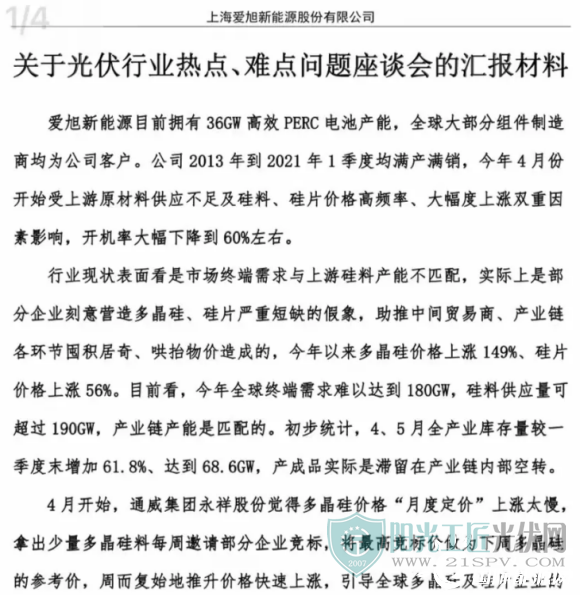 對于近期的硅料價格高幅度拉升,行業(yè)企業(yè)接連漲價的背景之下,今日,愛旭股份發(fā)布一篇《關(guān)于光伏行業(yè)熱點(diǎn)、難點(diǎn)問題座談會的匯報材料》的文章,引發(fā)行業(yè)關(guān)注與熱議。