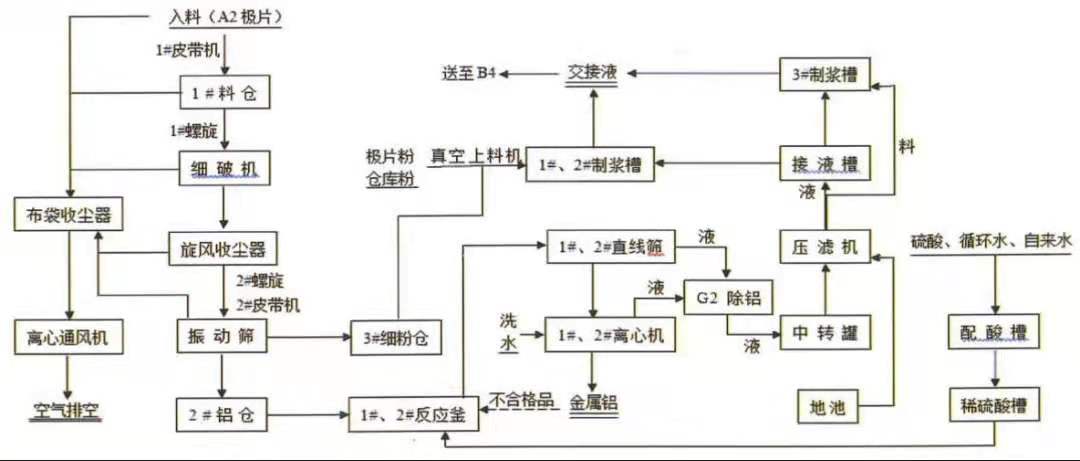 鋁渣為A3車(chē)間提取三元廢舊電池極片上的鎳、鈷、錳過(guò)程中所產(chǎn)生的附屬產(chǎn)品。邦普科技公司2018年8月15日開(kāi)始執(zhí)行的鋁渣生產(chǎn)工藝流程為:廢舊電池極片從A2車(chē)間輸送至A3車(chē)間進(jìn)入1#料倉(cāng),經(jīng)過(guò)細(xì)破機(jī),廢舊極片被打成小碎片(2012年12月22日開(kāi)始執(zhí)行的工藝前期流程為:廢舊電池極片經(jīng)過(guò)粗破機(jī)破碎后,先后經(jīng)過(guò)電加熱鋼帶爐和錘片式破碎機(jī),被打成小碎片。后續(xù)工藝流程不變),在碾壓撕扯中,部分鋁箔和表面粉料被機(jī)械分離,物料經(jīng)過(guò)振動(dòng)篩,篩上物為鋁渣,鋁渣表面附著大量的正極材料,篩下的極片粉料直接送往B4車(chē)間制漿,用于后續(xù)工藝。鋁渣輸送到反應(yīng)釜中與稀硫酸(0.5mol/L)混合,經(jīng)過(guò)20分鐘的高速攪拌,使鋁渣和粉料分離。固液混合物經(jīng)過(guò)直線篩后,鋁渣送至離心機(jī)洗水、甩干,鋁渣裝袋后送至危險(xiǎn)廢物暫存庫(kù)待檢區(qū),剛出來(lái)未冷卻的鋁渣不允許堆垛,檢測(cè)合格后才允許在危險(xiǎn)廢物暫存庫(kù)存放區(qū)堆碼(在待檢區(qū)主要檢測(cè)鈷鎳殘指標(biāo),最終鋁渣的鈷鎳殘留總含量控制標(biāo)準(zhǔn)在4%以下為合格,檢測(cè)結(jié)果一般需要一天)。鋁渣儲(chǔ)存數(shù)量達(dá)到裝車(chē)要求后,直接向外銷(xiāo)售。