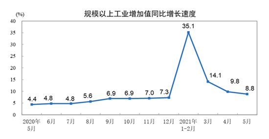 5月份,規(guī)模以上工業(yè)增加值同比實(shí)際增長(zhǎng)8.8%(以下增加值增速均為扣除價(jià)格因素的實(shí)際增長(zhǎng)率),比2019年同期增長(zhǎng)13.6%,兩年平均增長(zhǎng)6.6%。從環(huán)比看,5月份,規(guī)模以上工業(yè)增加值比上月增長(zhǎng)0.52%。1—5月份,規(guī)模以上工業(yè)增加值同比增長(zhǎng)17.8%,兩年平均增長(zhǎng)7.0%。