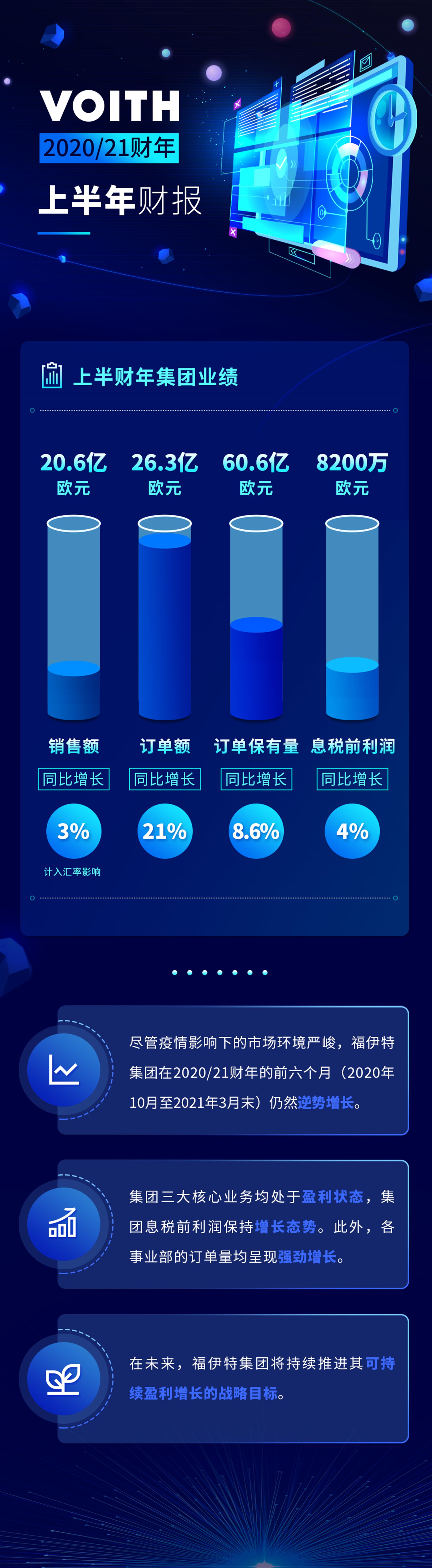 在本財(cái)年上半年,集團(tuán)取得了20.6億歐元的銷售額,略低于去年同期的20.8億歐元。在計(jì)入?yún)R率影響后,銷售額比去年同期增長3%。訂單額大幅增長21%,達(dá)到26.3億歐元(去年同期為21.7億歐元)。截至3月31日,訂單保有量達(dá)到60.6億歐元,在去年同期55.8億歐元的高位水平上再次強(qiáng)勢增長,創(chuàng)九年來的最高紀(jì)錄。此外,福伊特在上半財(cái)年經(jīng)營業(yè)績小幅上揚(yáng),息稅前利潤達(dá)8200萬歐元,同比增長4%。在受全球疫情影響的大環(huán)境下,福伊特2020/21財(cái)年上半年表現(xiàn)亮眼。盡管環(huán)境充滿挑戰(zhàn),凈利潤表現(xiàn)良好。