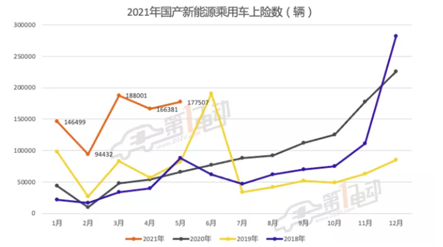 根據(jù)交強險數(shù)據(jù),2021年5月國產新能源乘用車上險量17.8萬輛,同比增長169.3%,環(huán)比增長6.7%。其中純電動車上險量14.8萬輛,占比83.3%,相比4月純電動車上險量占比進一步擴大;插電混合動力車型上險量2.9萬輛,占比16.7%。