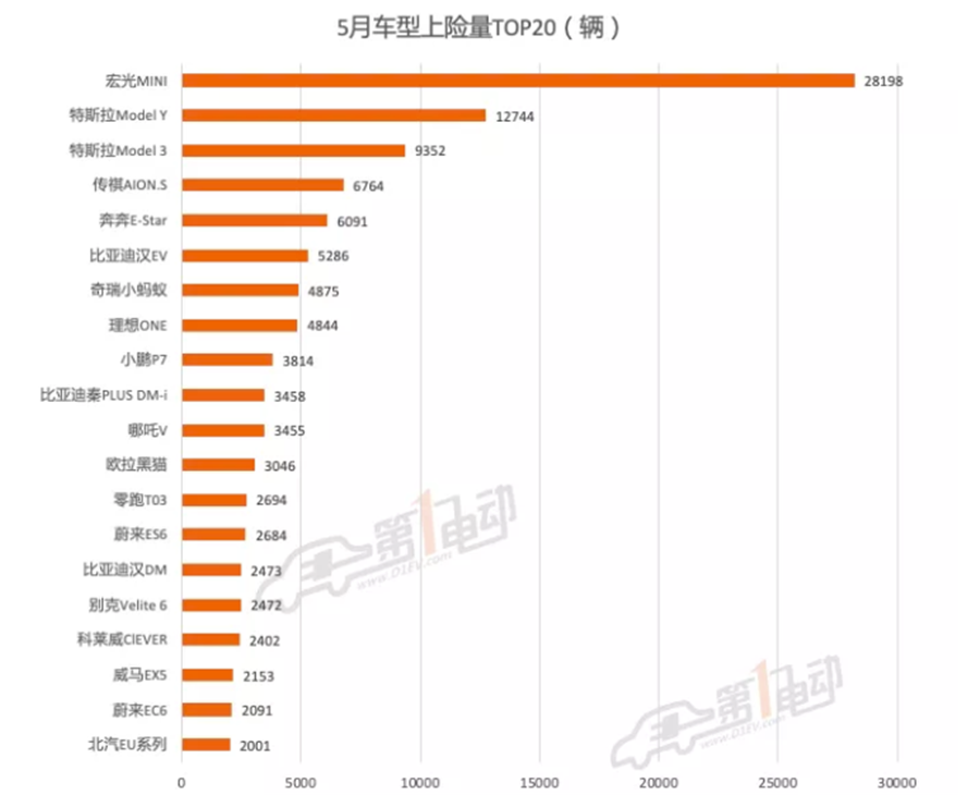 車型方面,宏光MINI穩(wěn)居第一,特斯拉Model Y環(huán)比暴漲131%,首超Model 3奪得亞軍,廣汽AION.S位居第四。奔奔E-Star超越比亞迪漢EV躋身前五,而歐拉黑貓從4月第二,暴跌至5月第12。
