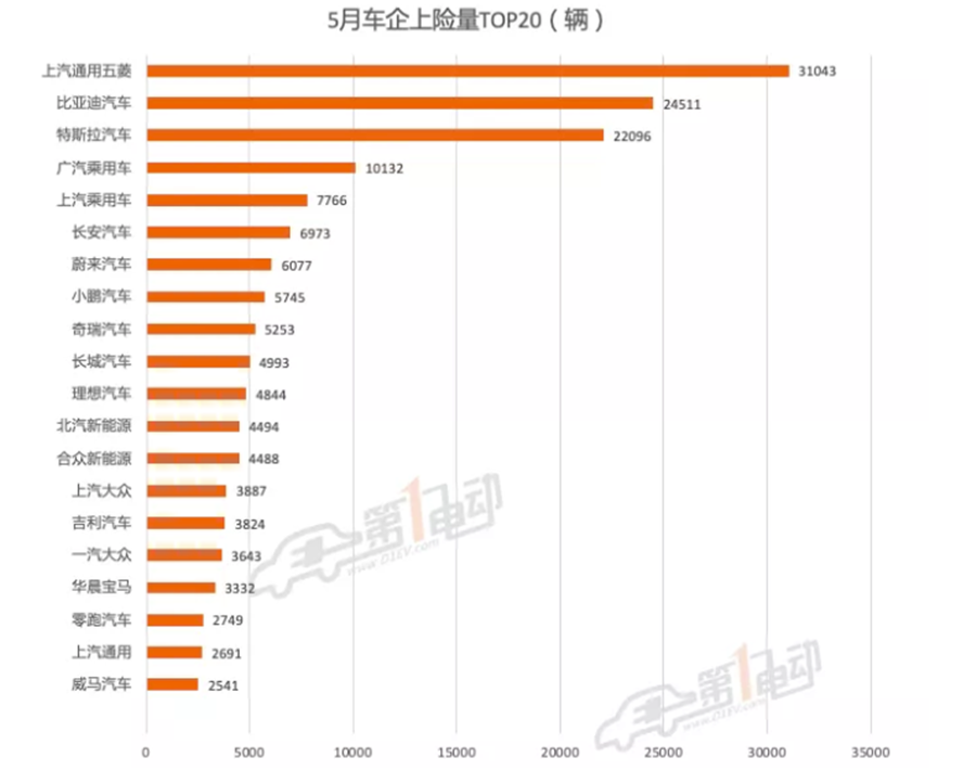 5月,上汽通用五菱繼續(xù)霸榜,比亞迪穩(wěn)居第二,特斯拉上險環(huán)比大漲84.8%,上升至第三。長城汽車上險環(huán)比“腰斬”從4月第三,下滑至5月第十。