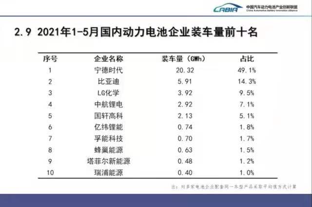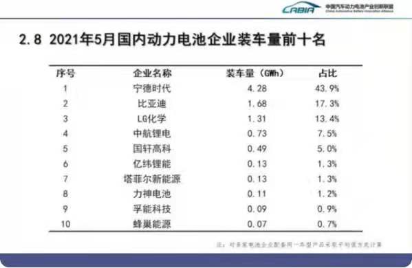 企業(yè)集中度方面,今年5月,我國新能源汽車市場共計(jì)41家動力電池企業(yè)實(shí)現(xiàn)裝車配套,較去年同期增加1家。排名前3家、前5家、前10家動力電池企業(yè)動力電池裝車量分別為7.3GWh、8.5GWh和9.0GWh,占總裝車量比分別為74.5%、87.1%和92.5%。另外,月度裝車量排名前五的動力電池企業(yè)分別為寧德時(shí)代、比亞迪、LG化學(xué)、中航鋰電、國軒高科。