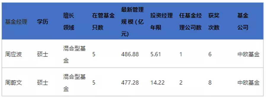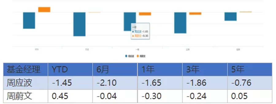 目前周蔚文和周應(yīng)波在管基金數(shù)量均為5只,并且管理規(guī)模也十分接近,周蔚文的管理規(guī)模為477.28億元,周應(yīng)波的管理規(guī)模為486.88億元。