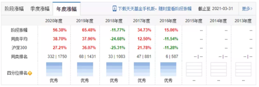 雖然成立的時間點比較尷尬,但在2016年,周應(yīng)波仍然取得了15.06%的正收益,成立至今(截止到2021年6月9日)基金獲得了323.98%的累計收益,在同期同類基金排名中位居第三,僅次于趙蓓的“工銀前沿醫(yī)療”和蕭楠的“易方達(dá)消費行業(yè)”。出色的業(yè)績使基金規(guī)模從成立之初的2000多萬元增長到如今的214億元。