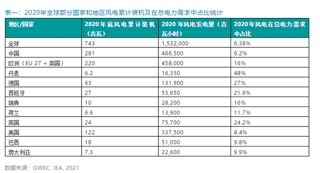 表一:2020年全球部分國(guó)家和地區(qū)風(fēng)電累計(jì)裝機(jī)及在總電力需求中占比統(tǒng)計(jì)