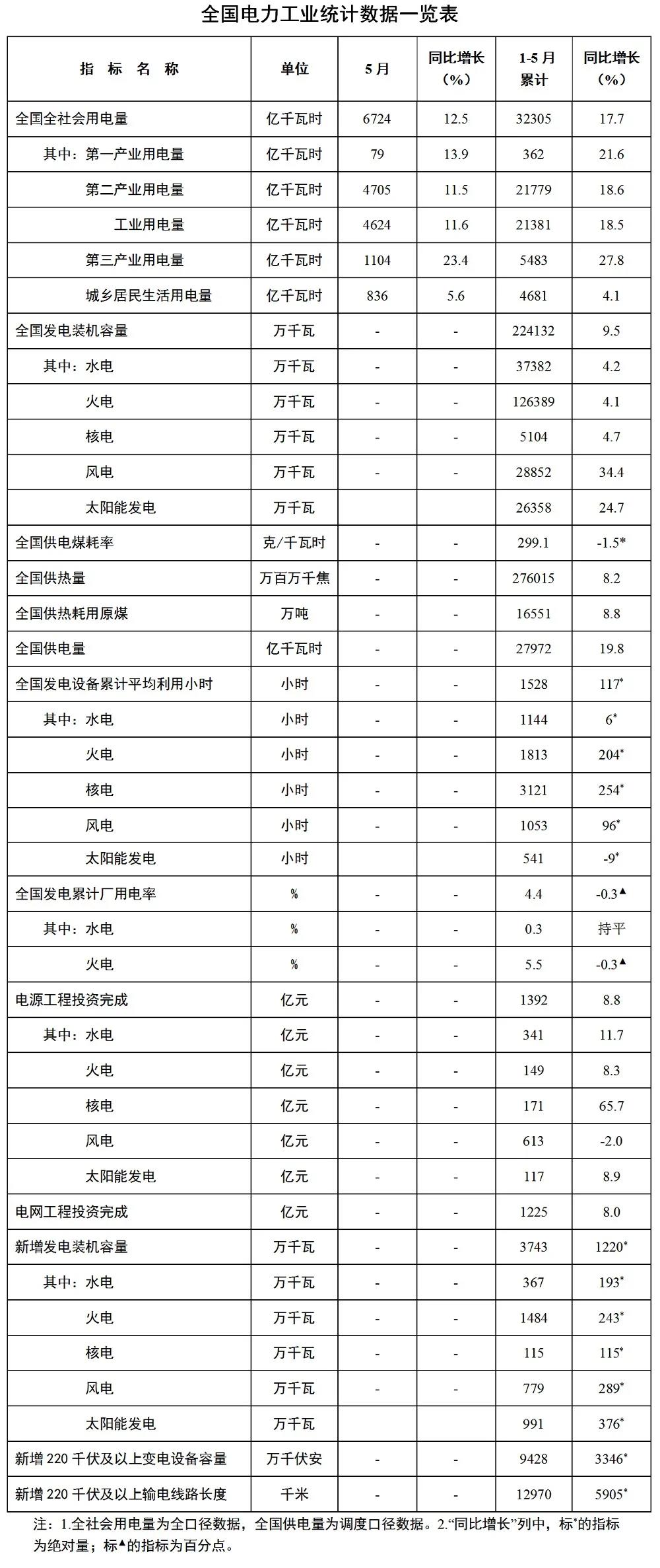 6月18日,國家能源局發(fā)布1-5月份全國電力工業(yè)統(tǒng)計數(shù)據(jù)。截至5月底,全國發(fā)電裝機(jī)容量22.4億千瓦,同比增長9.5%。其中,風(fēng)電裝機(jī)容量2.9億千瓦,同比增長34.4%;太陽能發(fā)電裝機(jī)容量2.6億千瓦,同比增長24.7%。